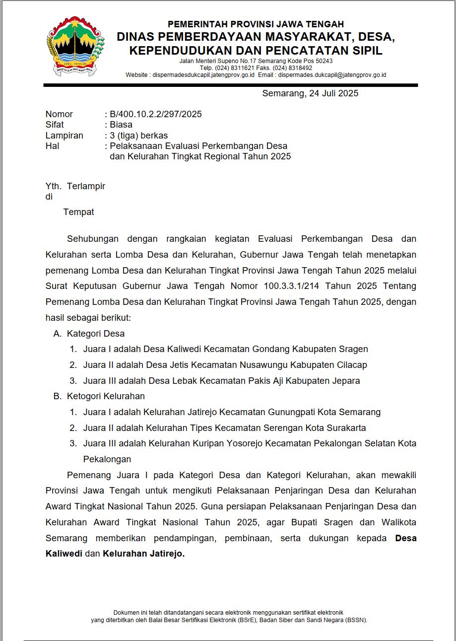 Juara 2 Lomba Desa dan Kelurahan Tingkat Provinsi Jawa Tengah tahun 2025